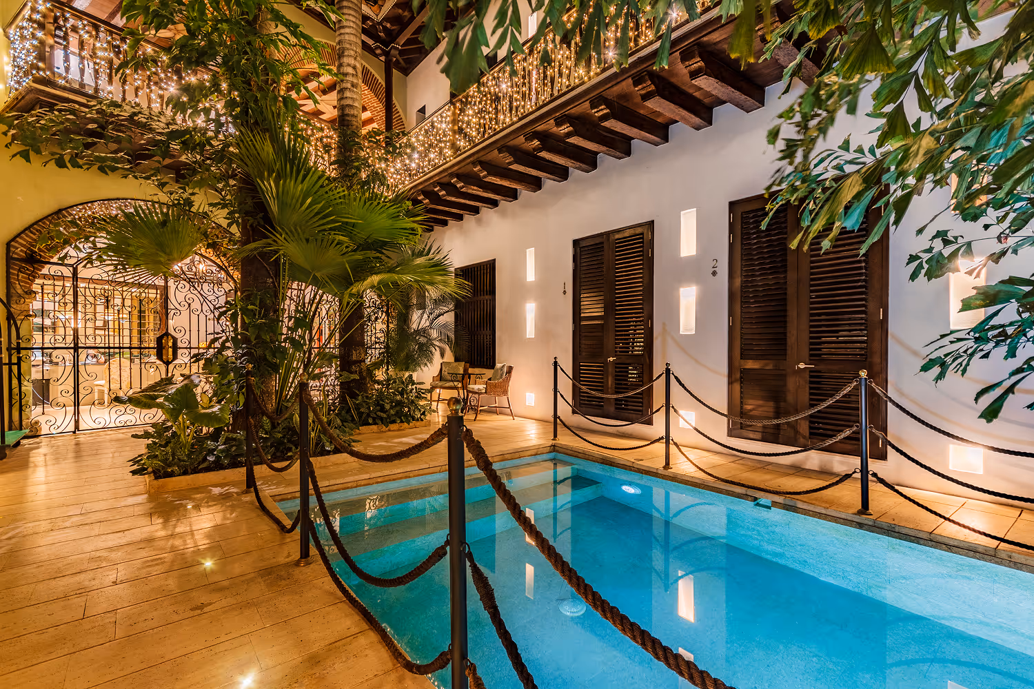 Las habitaciones evocan el encanto colonial con techos altos, balcones de madera y detalles artesanales. Cada espacio integra un diseño funcional y sofisticado, acompañado de una atmósfera tranquila. El rooftop con piscina ofrece vistas panorámicas de los patios y el recinto amurallado, creando un entorno ideal para disfrutar la esencia de Cartagena.